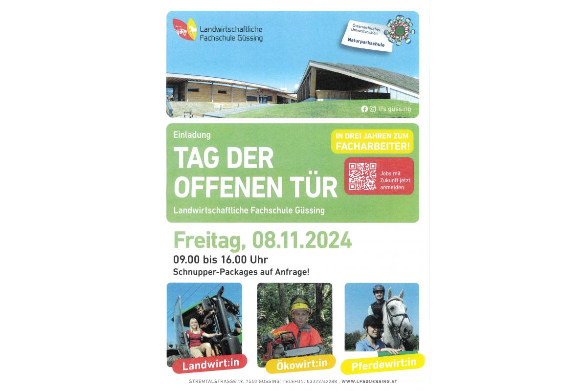 Die Landwirtschaftliche Fachschule Güssing lädt am Freitag, den 07. November 2025 zum Tag der offenen Tür herzlichst ein. Siehe Anlage!