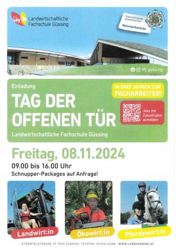 Die Landwirtschaftliche Fachschule Güssing lädt am Freitag, den 07. November 2025 zum Tag der offenen Tür herzlichst ein. Siehe Anlage!